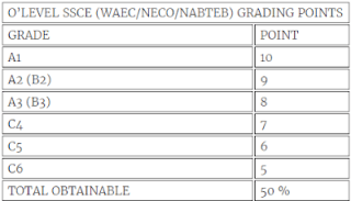 The Screening of Candidate(s) will be based on Point Grading System, using the UTME Score and SSCE (or equivalent) Grades in Five (5) BEST RELEVANT subjects to Candidate’s Choice of Course