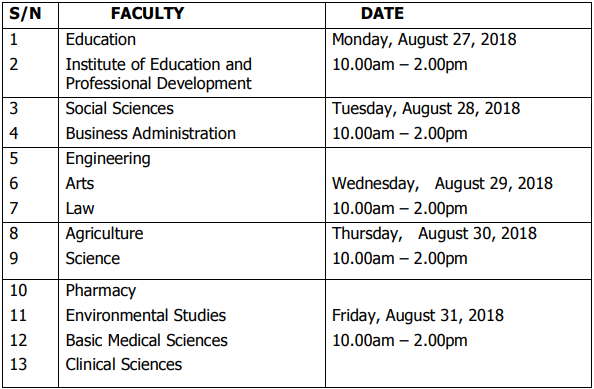 This is to inform all candidates who applied for admission into the Postgraduate Programmes of the University of Uyo (UNIUYO) for the 2018/2019 Academic Session that, dates for screening exercise which was earlier scheduled to hold from Monday, August 20, 2018 to Friday, August 24, 2018 has been rescheduled as follows: